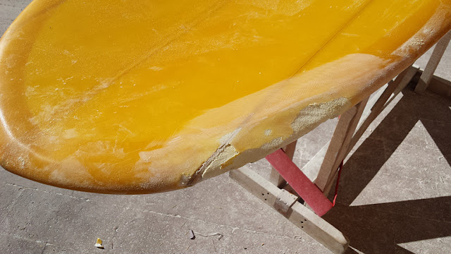 En este caso, mezclamos resina con polvo de sílice para que al reparar el foam no quede tan pegote y se difumine más la reparación (el color no queda tan sólido). En este caso me ayuda a disimular el golpe, tintar la resina del color amarillo más claro que tenga la tabla, de esta forma ya voy igualando el color, y luego termino de ajustarlo laminando con resina tintada.